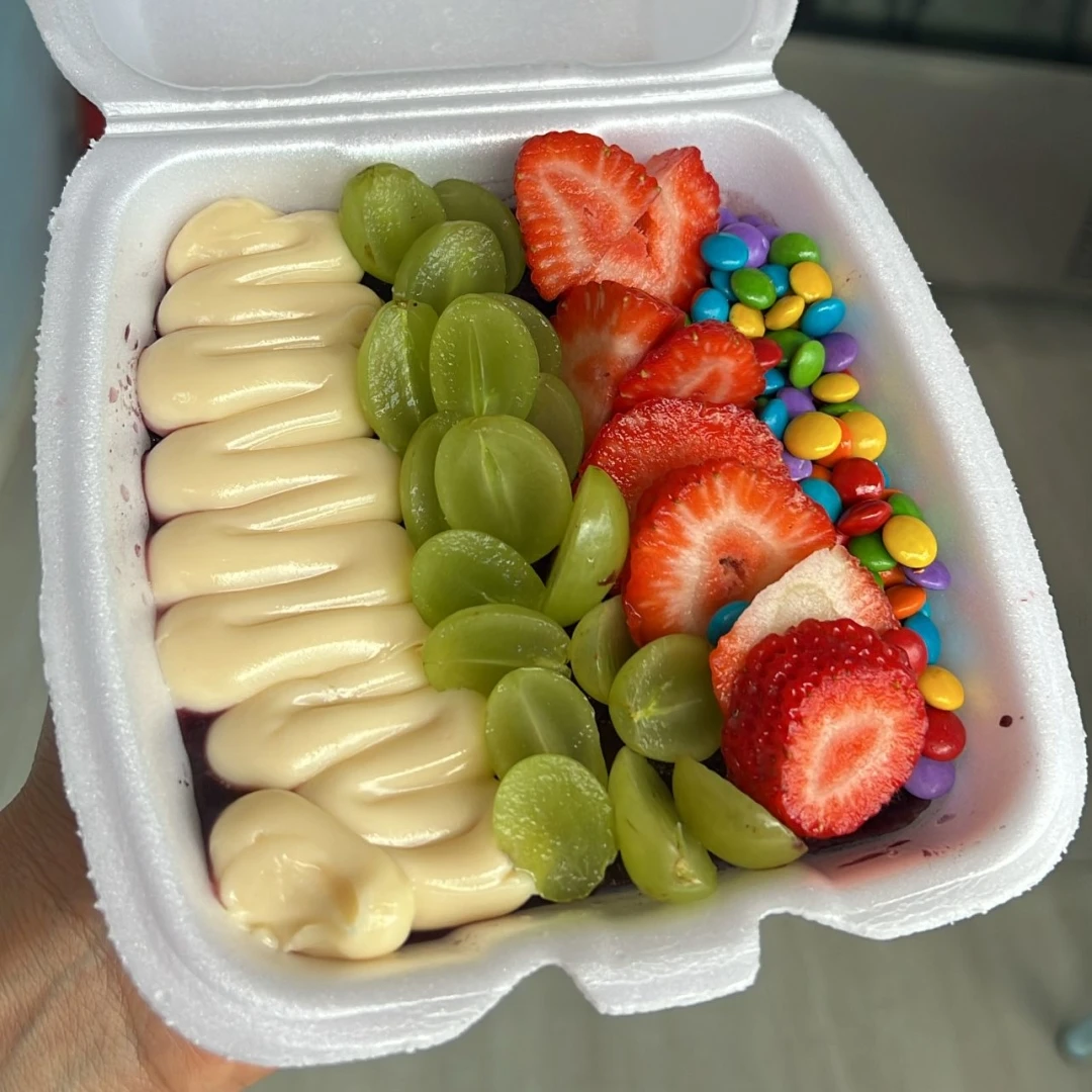 Açai 300ml com brigadeiro de ninho, morangos, uvas e confete