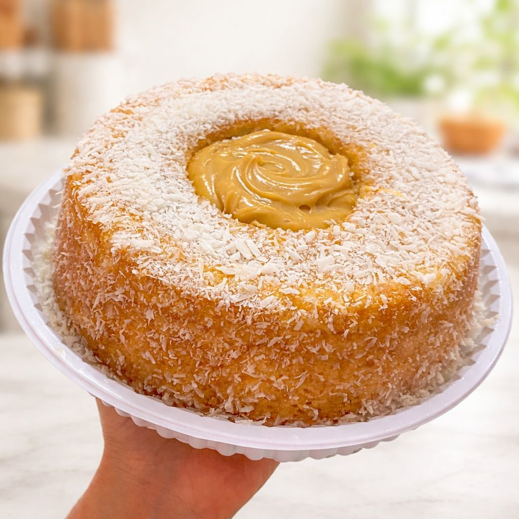 Finalizado com coco ralado por cima, ele ganha ainda mais sabor quando servido com uma generosa camada de doce de leite artesanal.